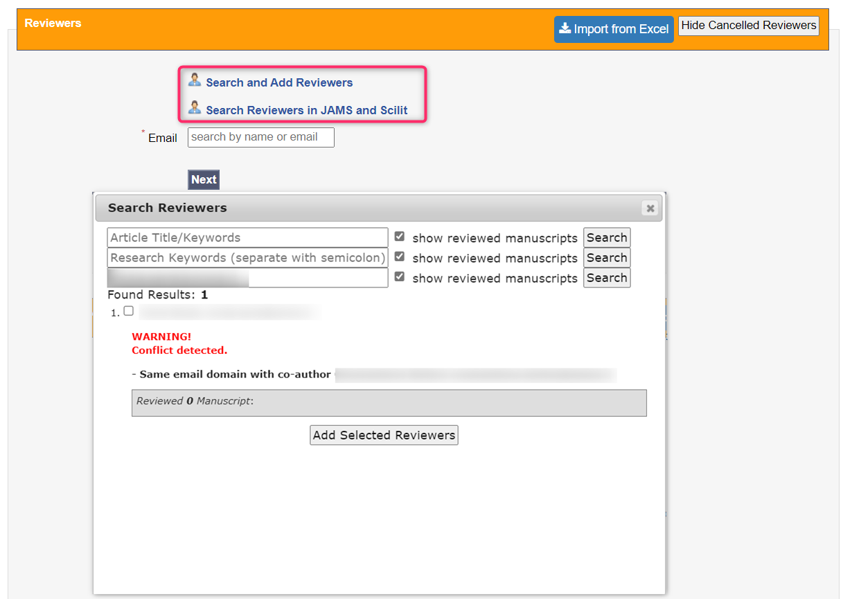 The logic of the Conflict of Interest check has been fixed to kick in when adding a reviewer through the Search and Add Reviewer as well as the Search Reviewers in JAMS and Scilit functions.